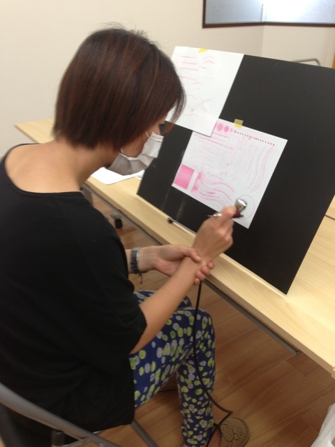 ボディペイントアートスクールは、衣類へのペイントも授業内容に含まれているため、授業中、ボディペイントよりも、そっちが気になったみたいで、さっそく活動してます♪